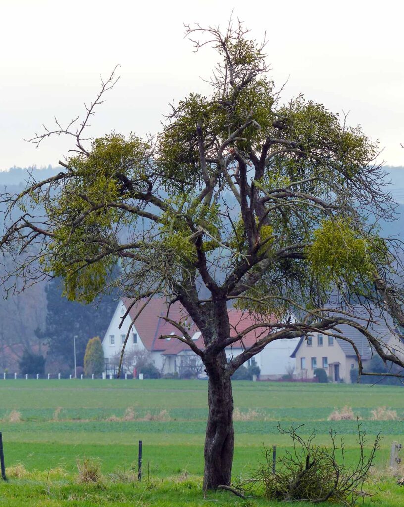 Die Laubholzmistel muss dringend bekämpft werden. Sie ist inzwischen in vielen Gebieten auf dem Vormarsch und gefährdet alte wie junge Obstbestände. Wenn jetzt nichts getan wird, so befürchten wir, könnten in 10-20 Jahren auch die letzten Bestände befallen und nachhaltig geschädigt sein. Baumbesitzer:innen und Straßenämter sollten die Mistel wo immer möglich entfernen, um die Ausbreitung einzudämmen.